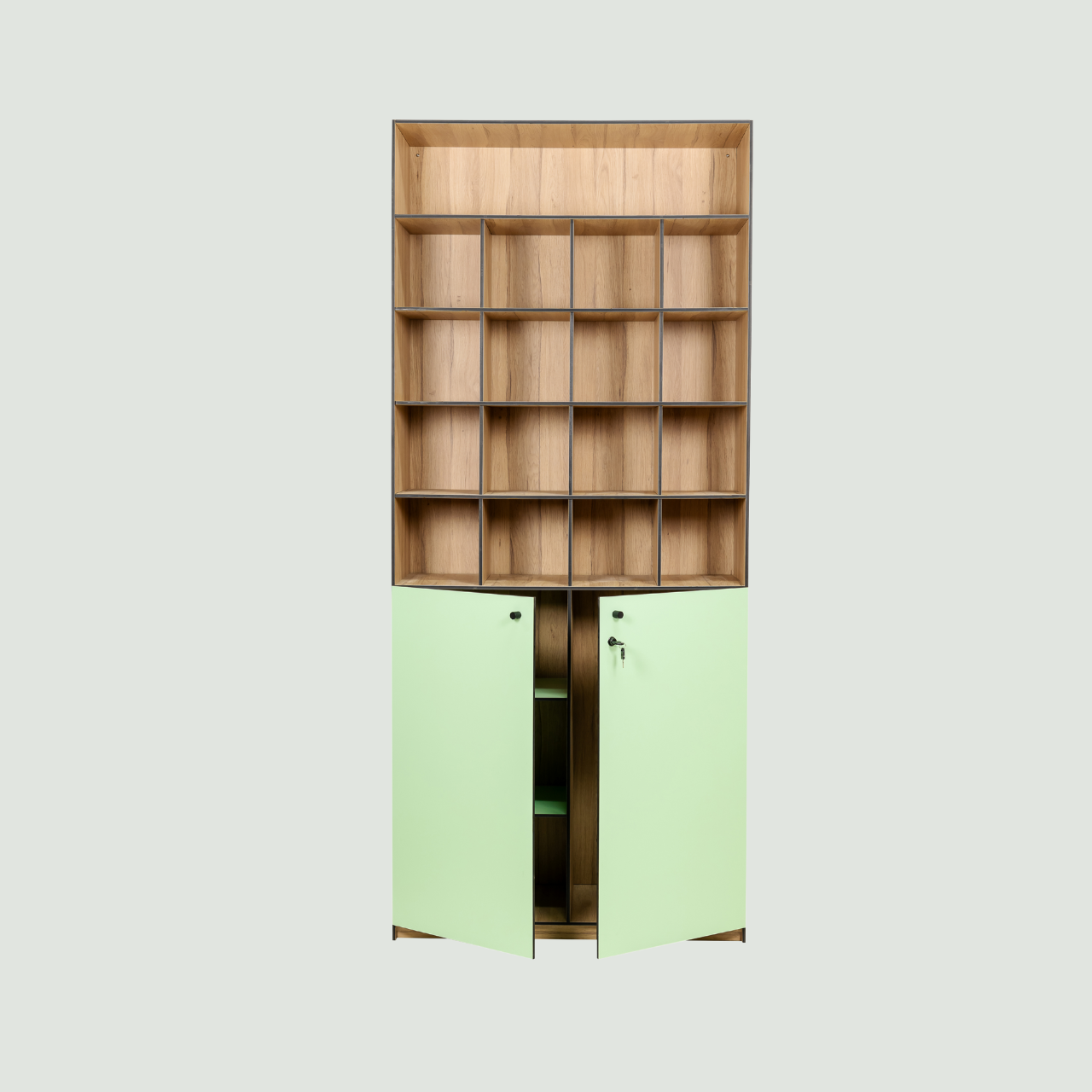 Le meuble de rangement avec ses 16 casiers ouverts en partie haute, et ses deux rangements portes en partie basse trouvera sa place dans l’entrée mais aussi dans l’espace de change .