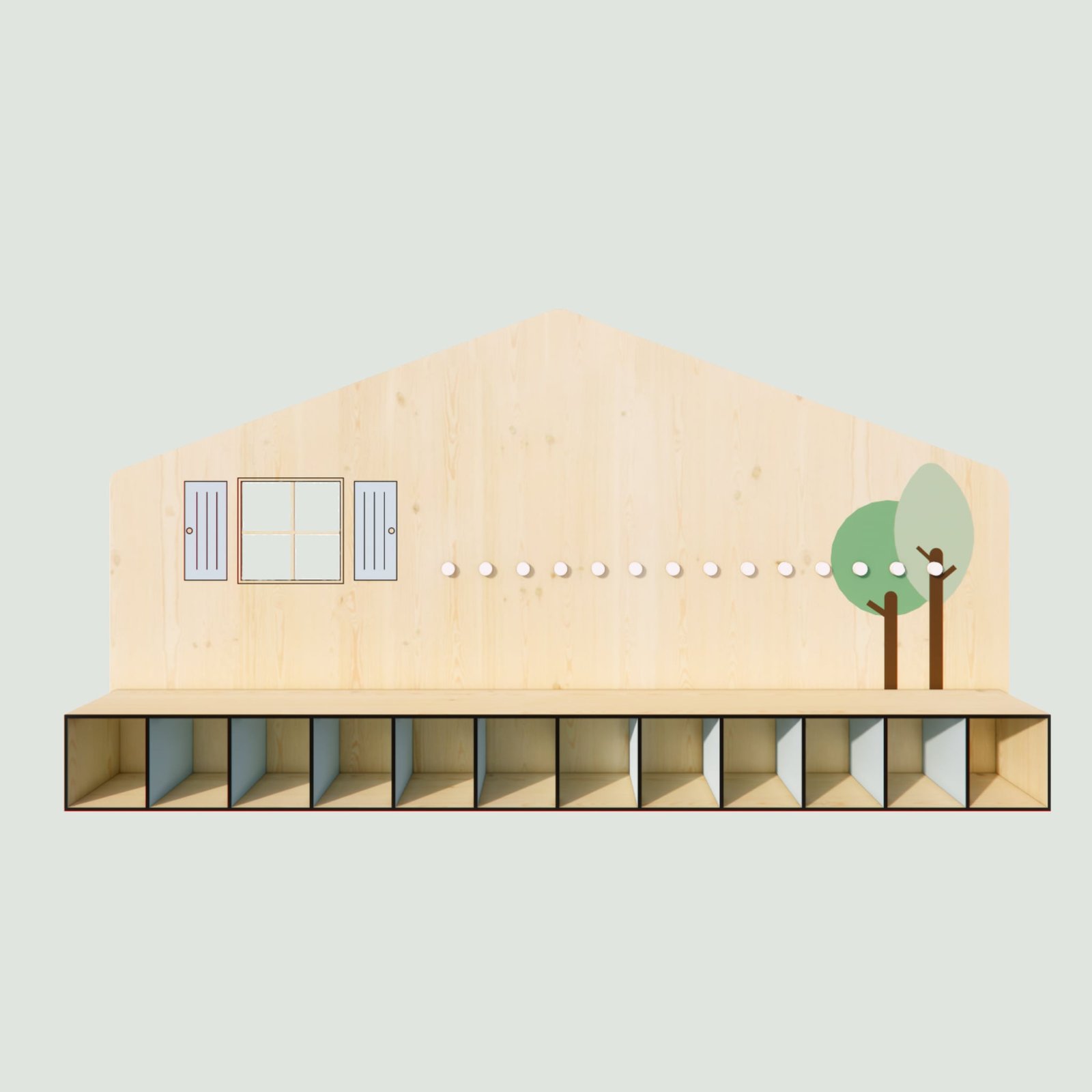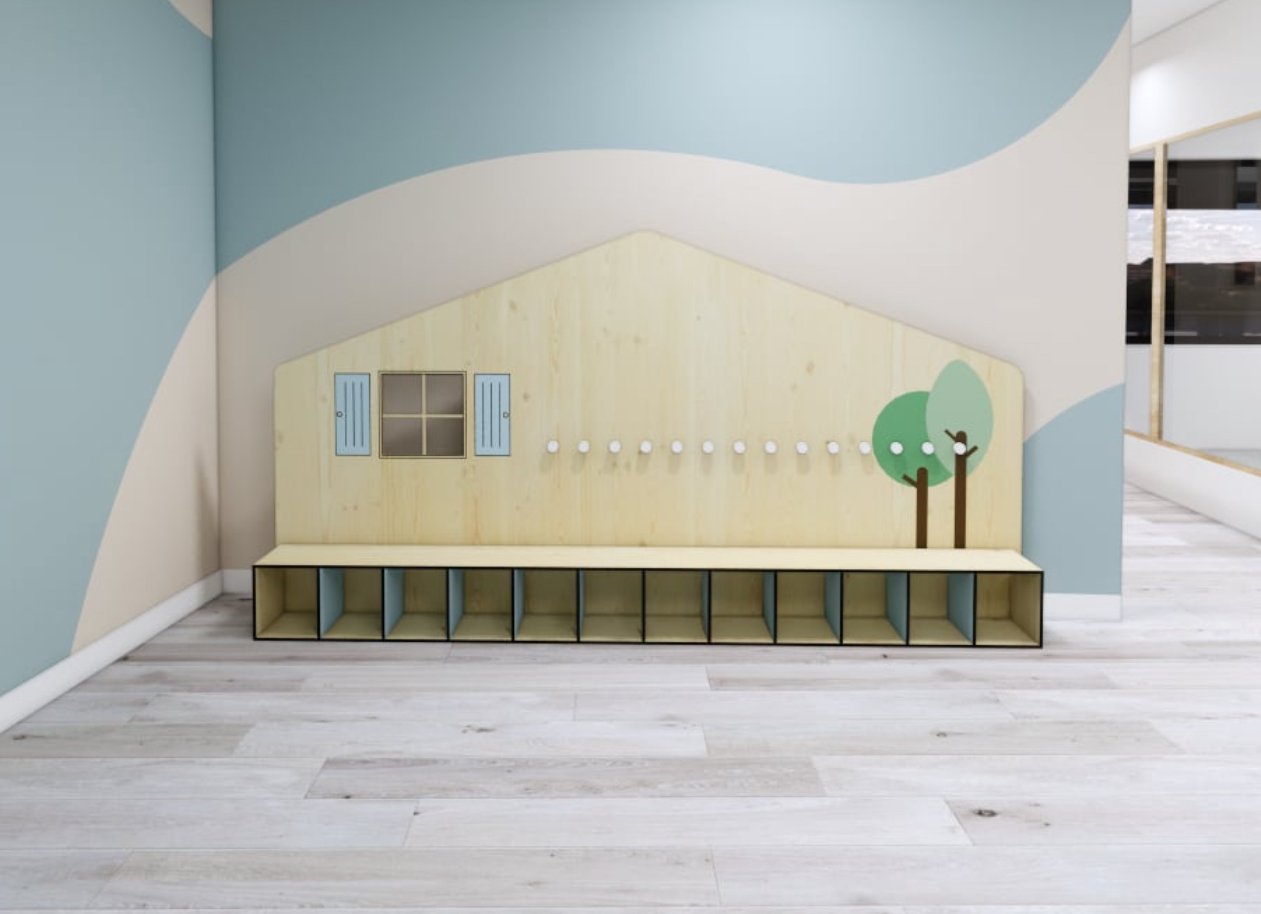 Le banc vestiaire en forme de grande maison offre un espace d’accueil attrayant pour les tout-petits .