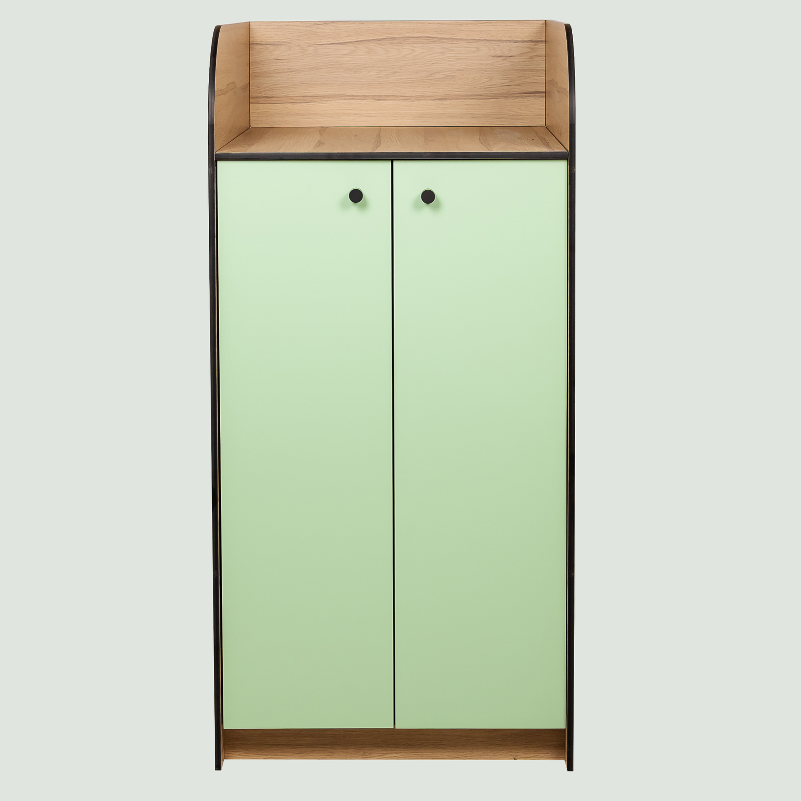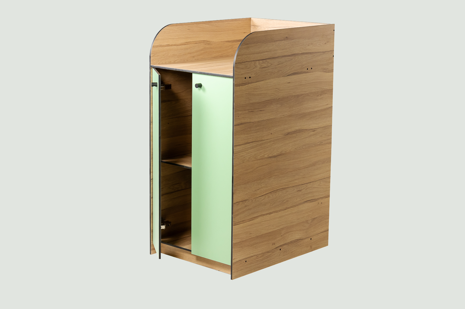 Le meuble de déshabillage deux portes avec son espace de change permet d’asseoir l’enfant pour le déshabiller ou l’habiller à l’arrivée ou au départ de la crèche.
