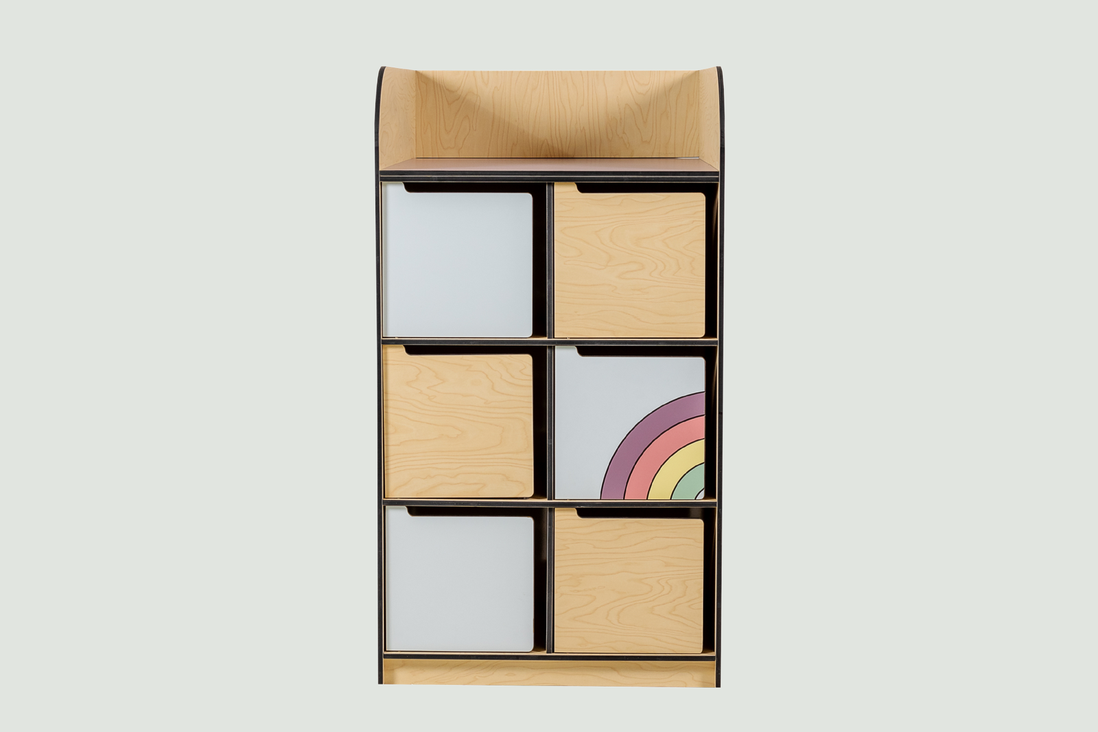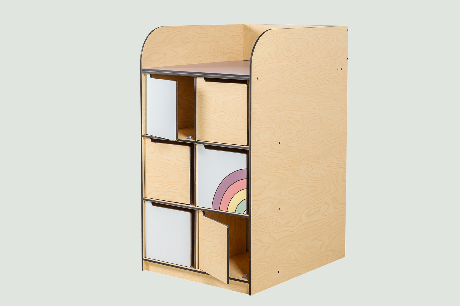 Le meuble de déshabillage arc en ciel avec son espace de change permet d’asseoir l’enfant pour le déshabiller ou l’habiller à l’arrivée ou au départ de la crèche.