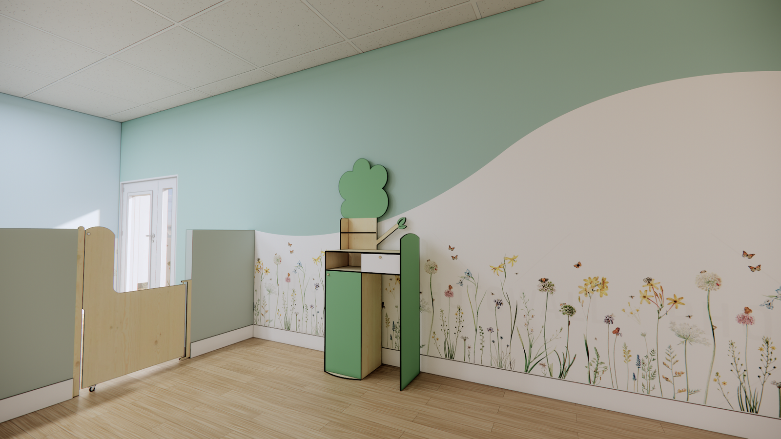 Fonctionnelle grâce a ses rangements sécurisés , elle facilite les échanges entre les familles et l’équipe.