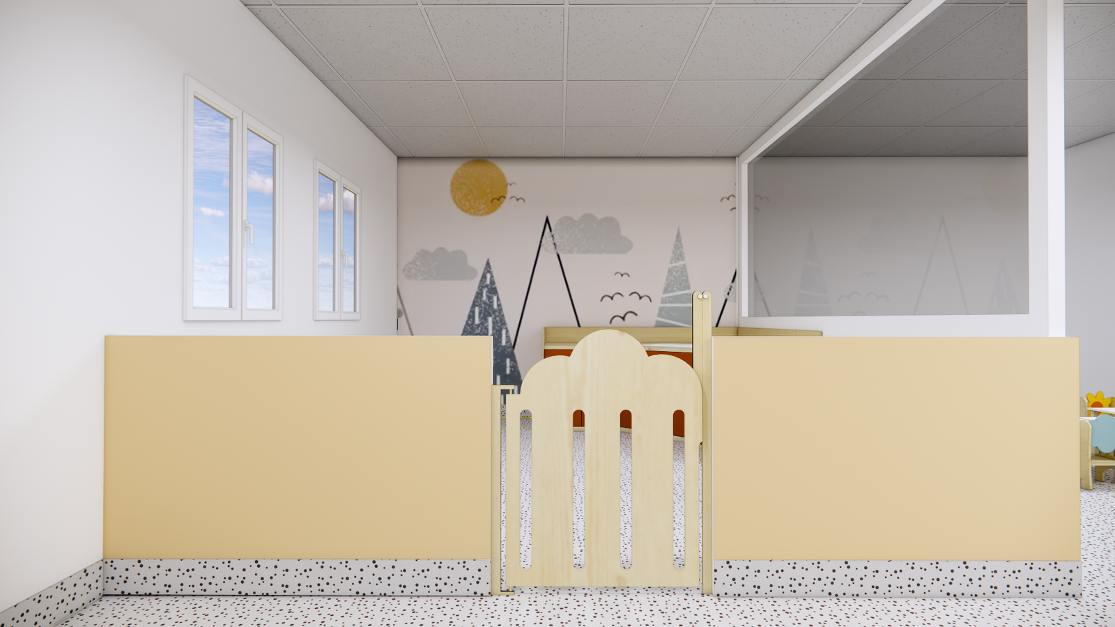 À partir de 585.00 € HTLe portillon nuage avec hublot apporte une touche de douceur au espace en crèche et une sécurité optimale .
