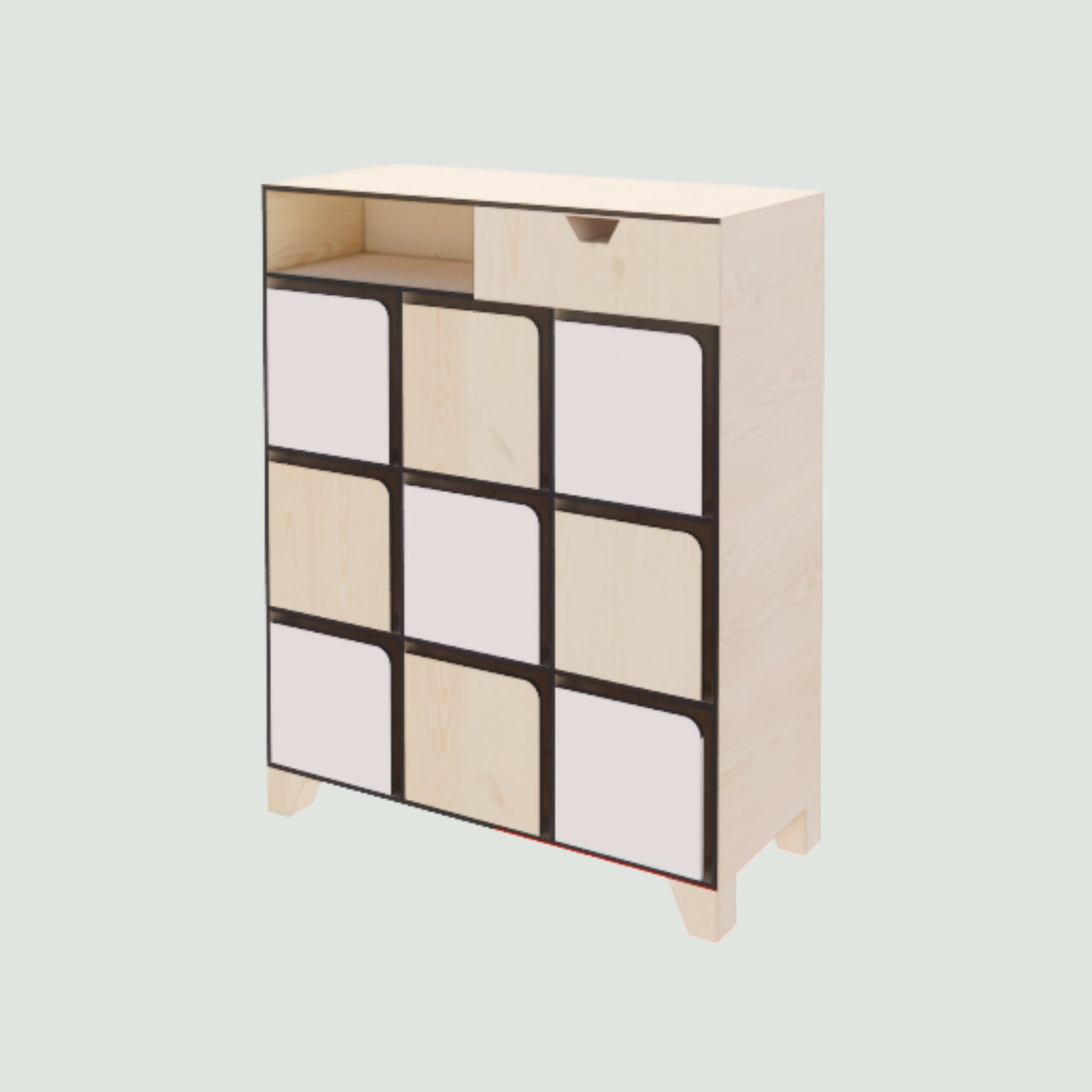Vestaire 9 casiers avec espace tiroir et niche avec porte anti pince doigts pour favoriser l’autonomie des tout-petits.